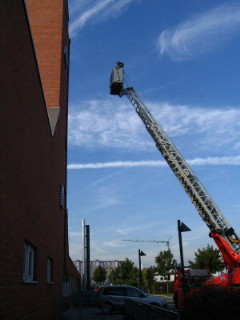 Feuerwehr aus dem Korb der Drehleiter in ein