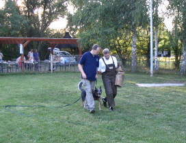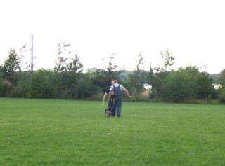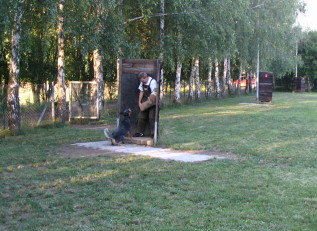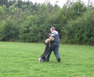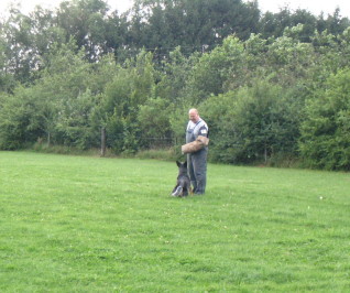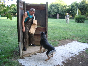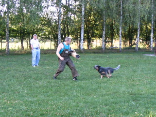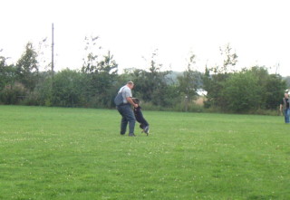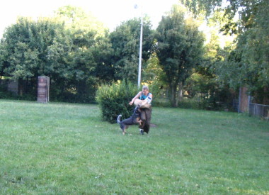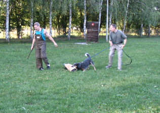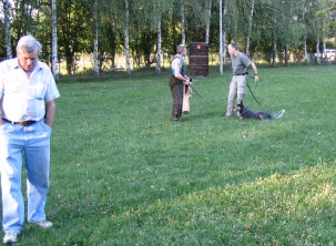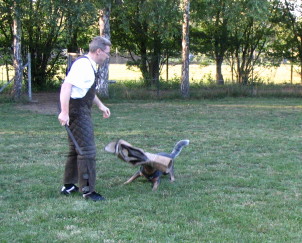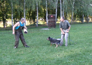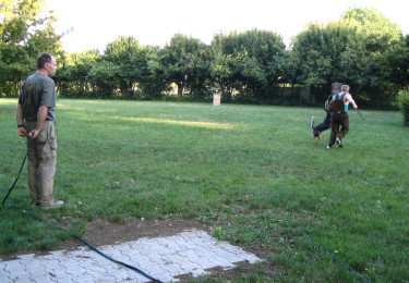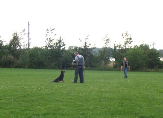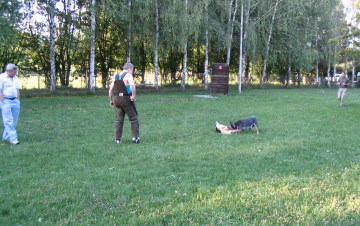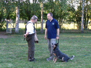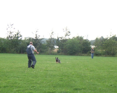 Schutzhunde- Training: ruhig dabei liegen oder sitzen, wenn Herrchen